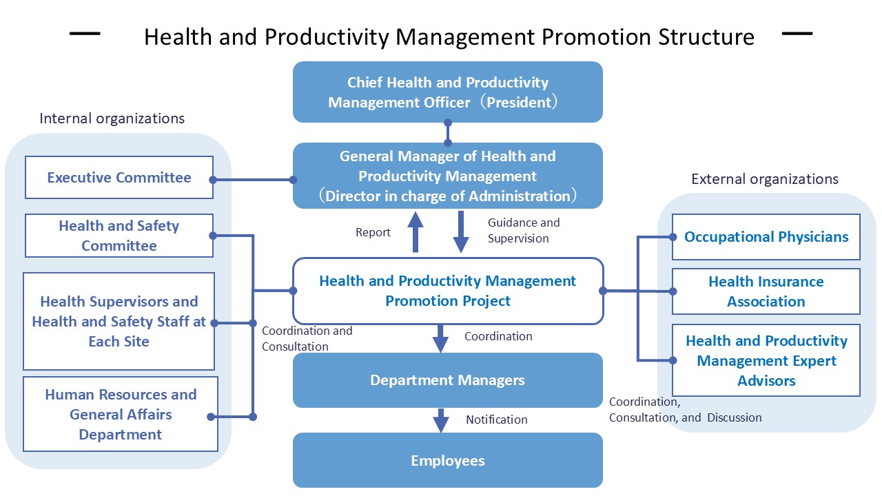 As a company-wide framework aimed at maintaining and promoting the health of employees across the Group, the executive officer in charge of administration, together with the Health and Productivity Management Promotion Project team, takes a central role in providing oversight and supervision. They collaborate and coordinate with external organizations and internal departments, share information, and examine initiatives based on data while verifying their effectiveness.