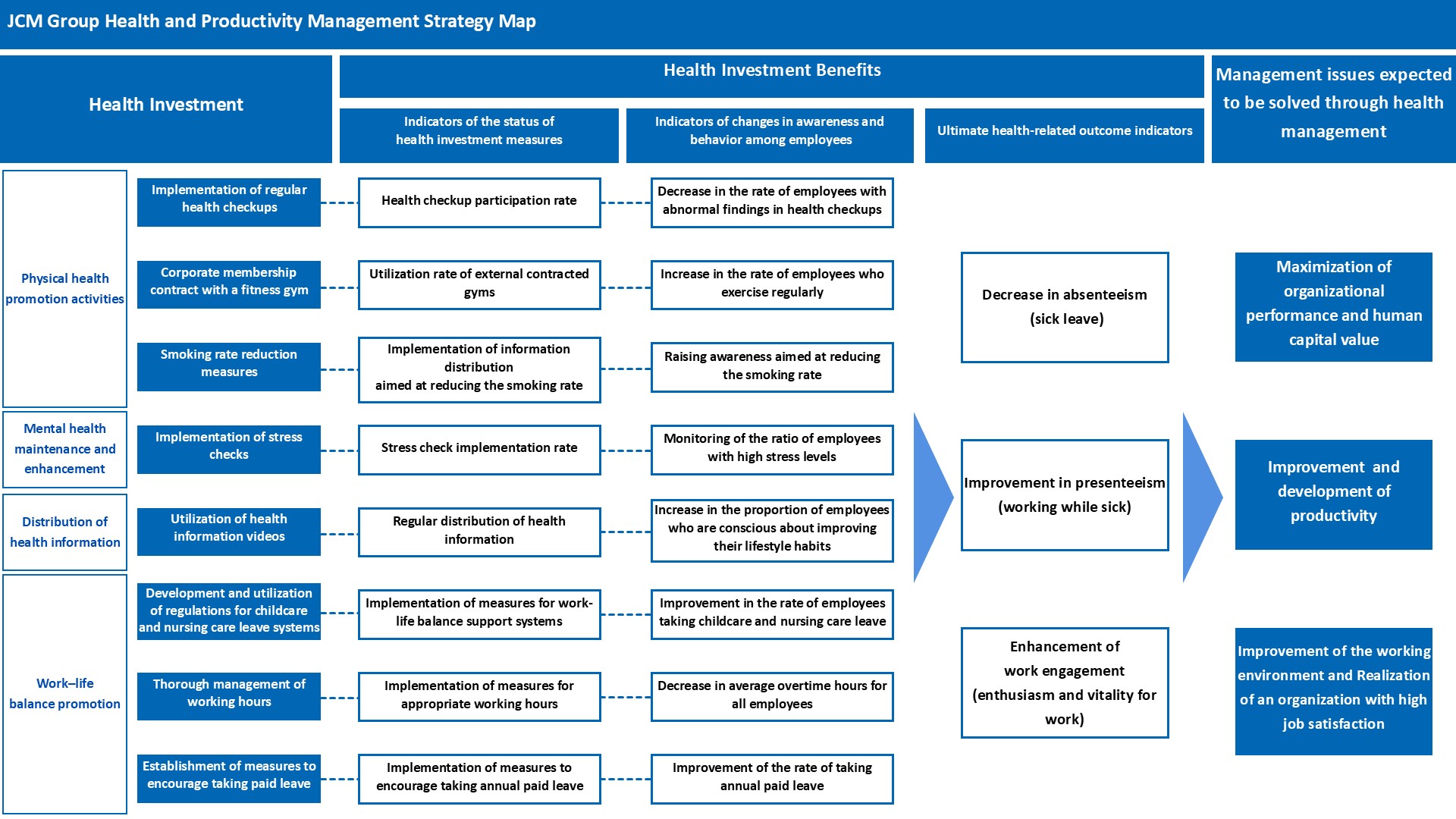 "JCM Group respects the physical and mental health of every employee and their families, and works to realize our corporate principle, “Let’s create a happy home and a pleasant workplace,” through Health and Productivity Management."